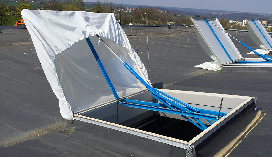 Ein wirkungsvoller Insektenschutz für alle Arten der Belüftung auf dem Dach, z.B. bei Brauereien, Bäckereien, Lebensmittelherstellern, Molkereien, Laboren etc.. Im Gegensatz zu herkömmlichen Netzen, die direkt in die Lichtkuppeln oder Lichtbandklappen intigriert sind, montieren wir passgenaue Netze über die Lüftungsklappen, Lichtbänder oder Lichtkuppeln.