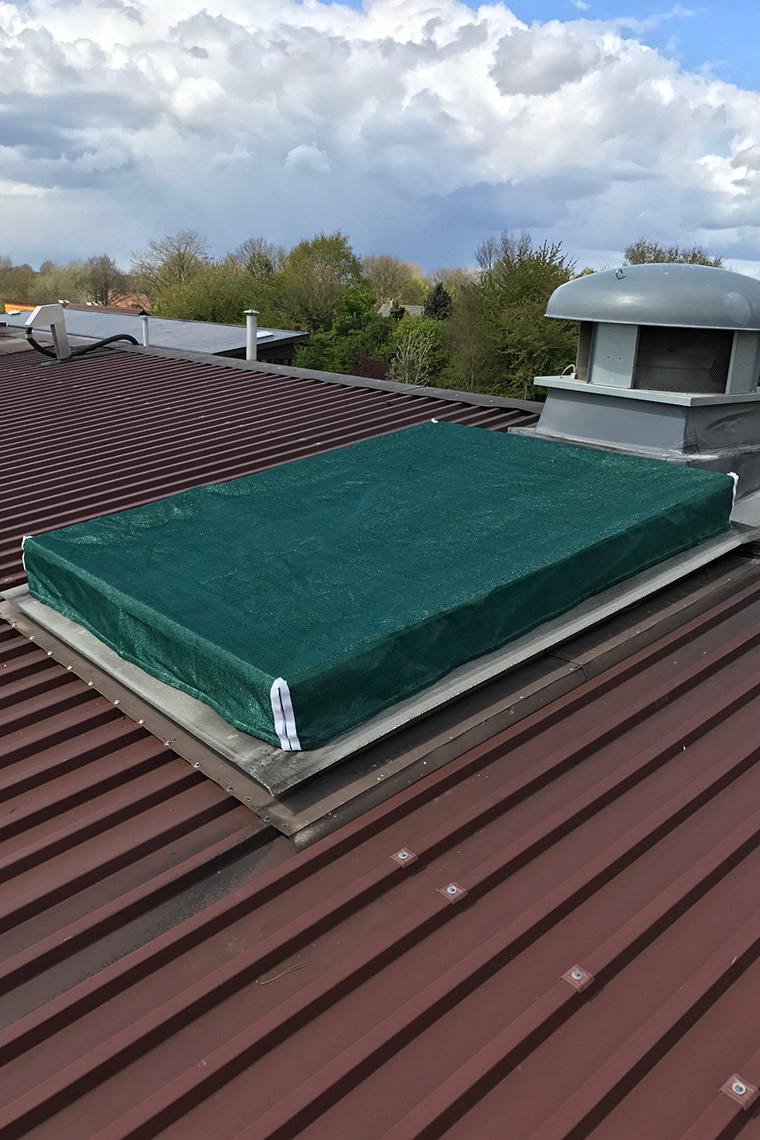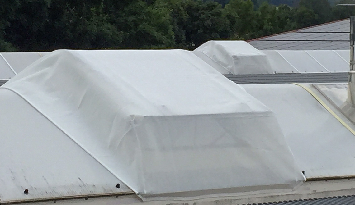 Jaku-Net produziert individuell und wir montieren die Netze über die Lüftungsklappen, Lichtbänder oder Kuppeln und befestigen sie mit Verschraubungen oder Klettverbindungen.